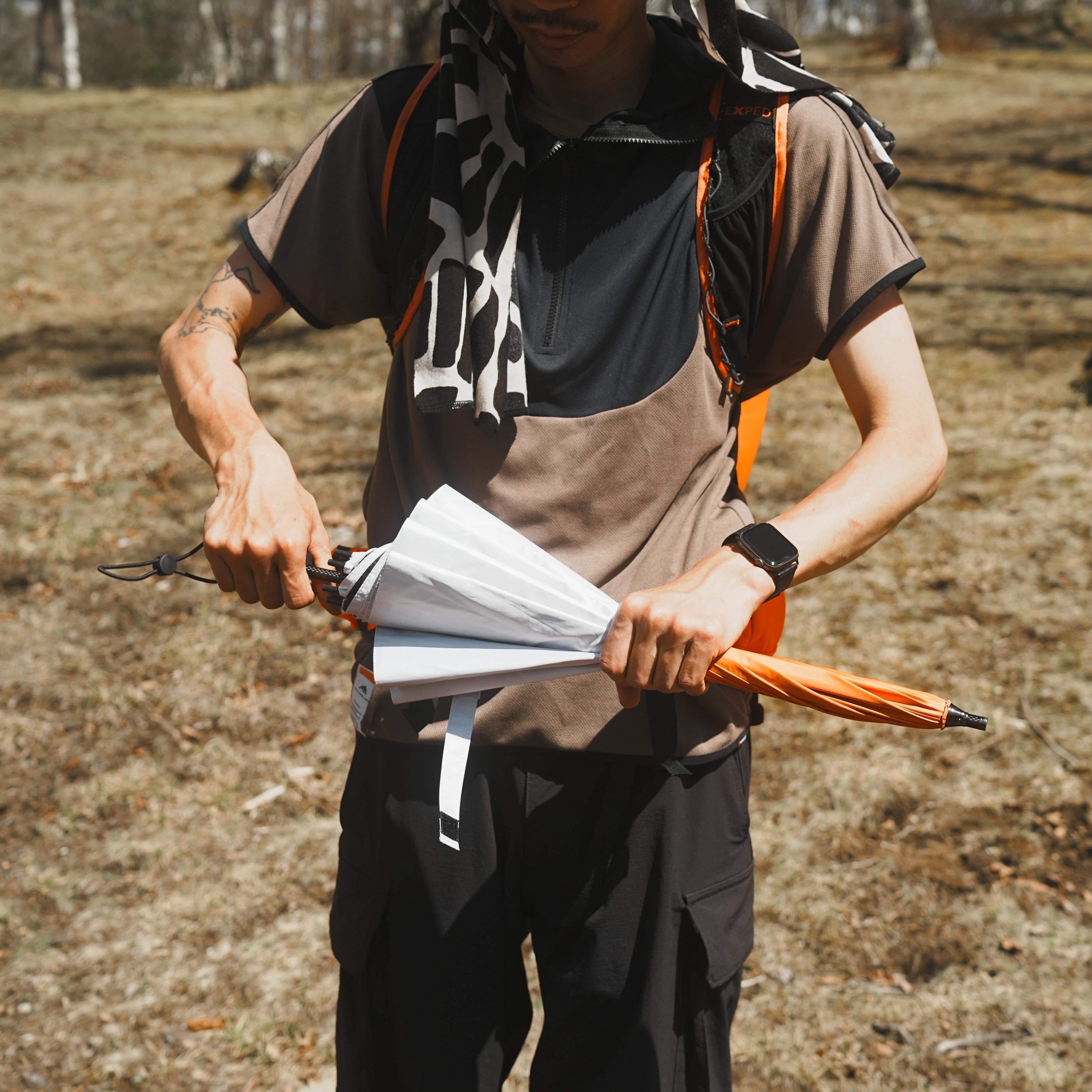 仕舞寸は長さ61.5cm未満と長傘としてはかなりコンパクトです。バックパックのサイドポケットに収納する際にも伸縮タイプのトレッキングポールより短く、頭より上に出ないため樹林帯などでも枝に引っ掛けにくいサイズ感となっています。