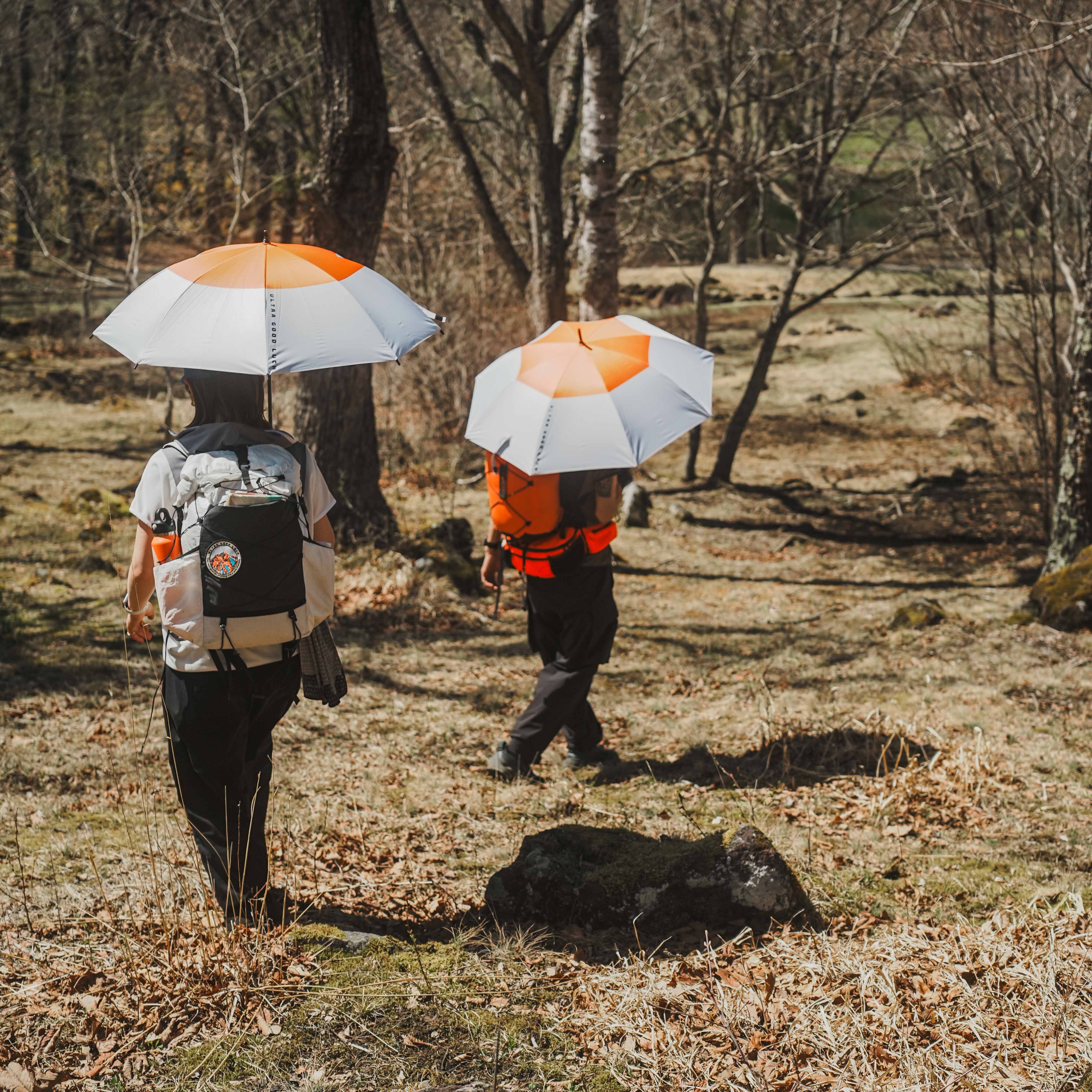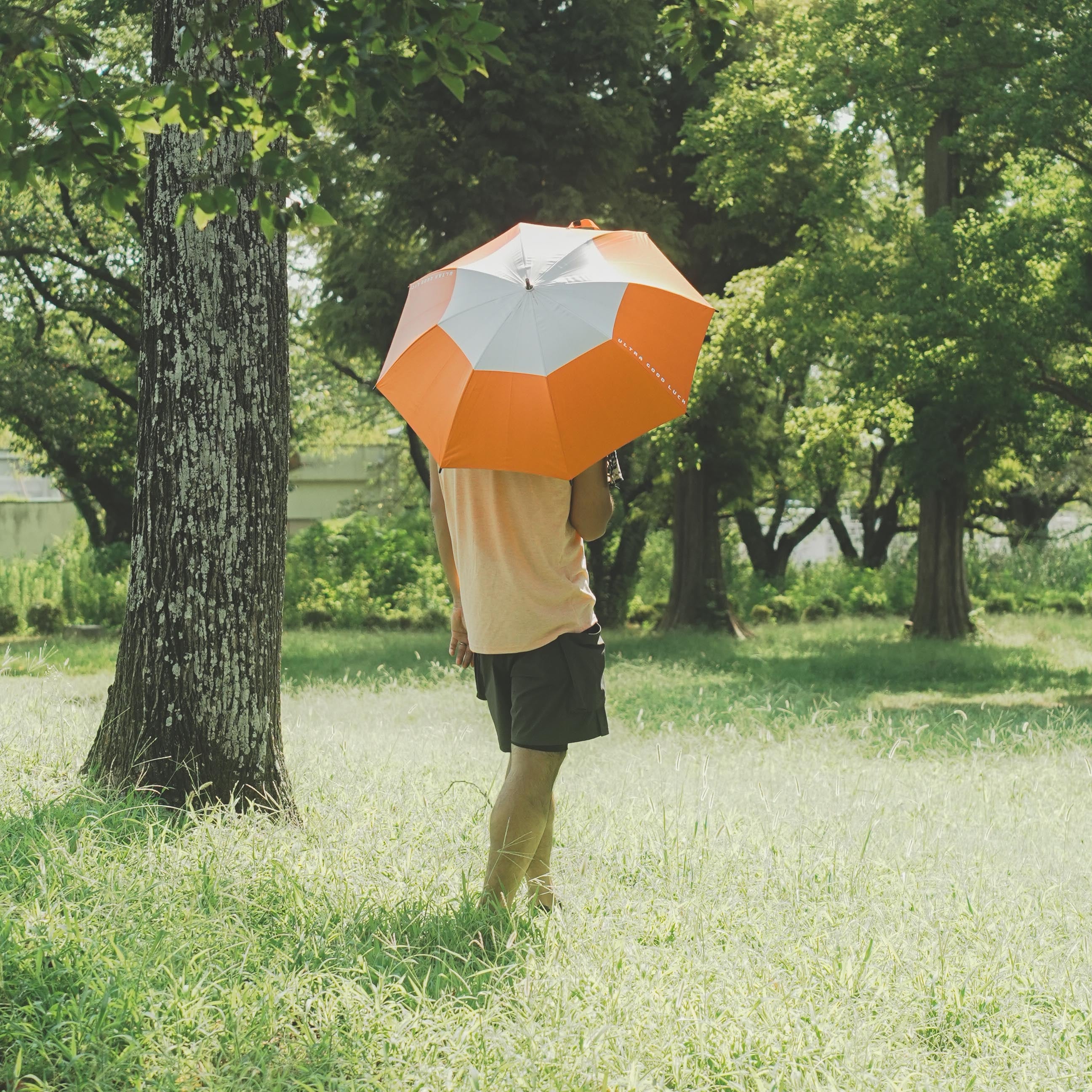 アウトドアシーンでも良く見かけるゴールドやシルバーではなく、街中やアウトドアシーンで日傘をさしていても「あ、いた!」と見つけやすいよう、白地にオレンジのアクセントカラーを加えたデザインとしました。
