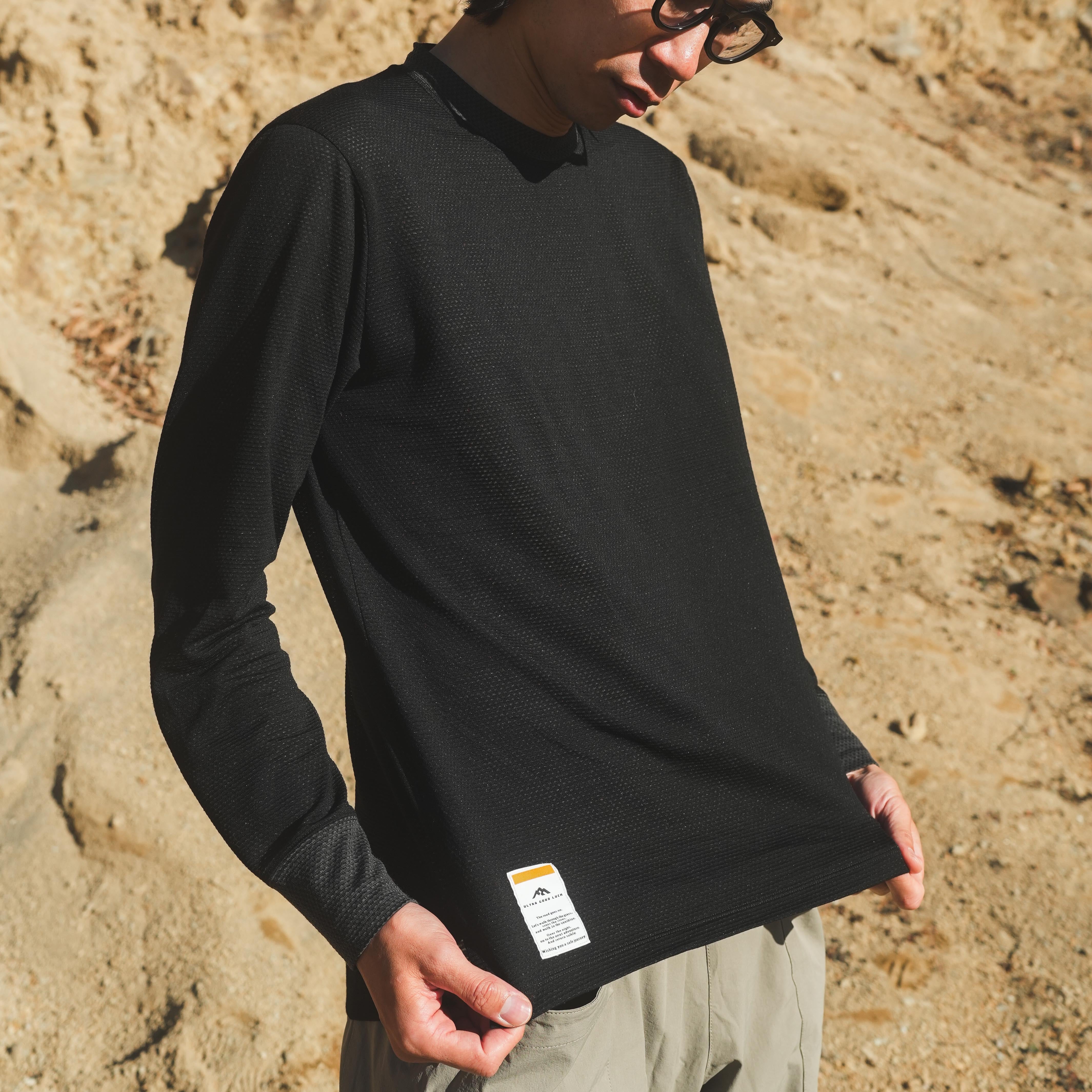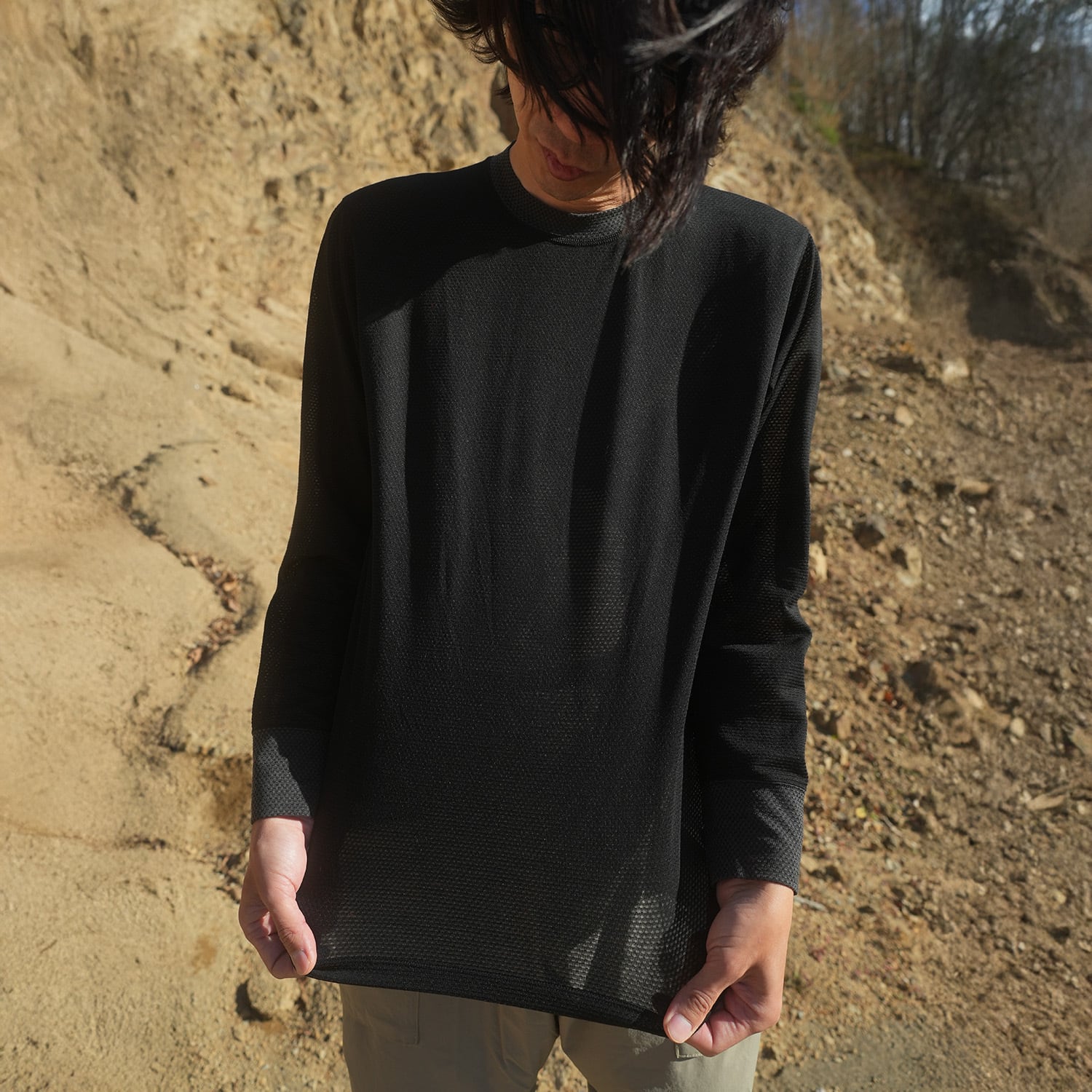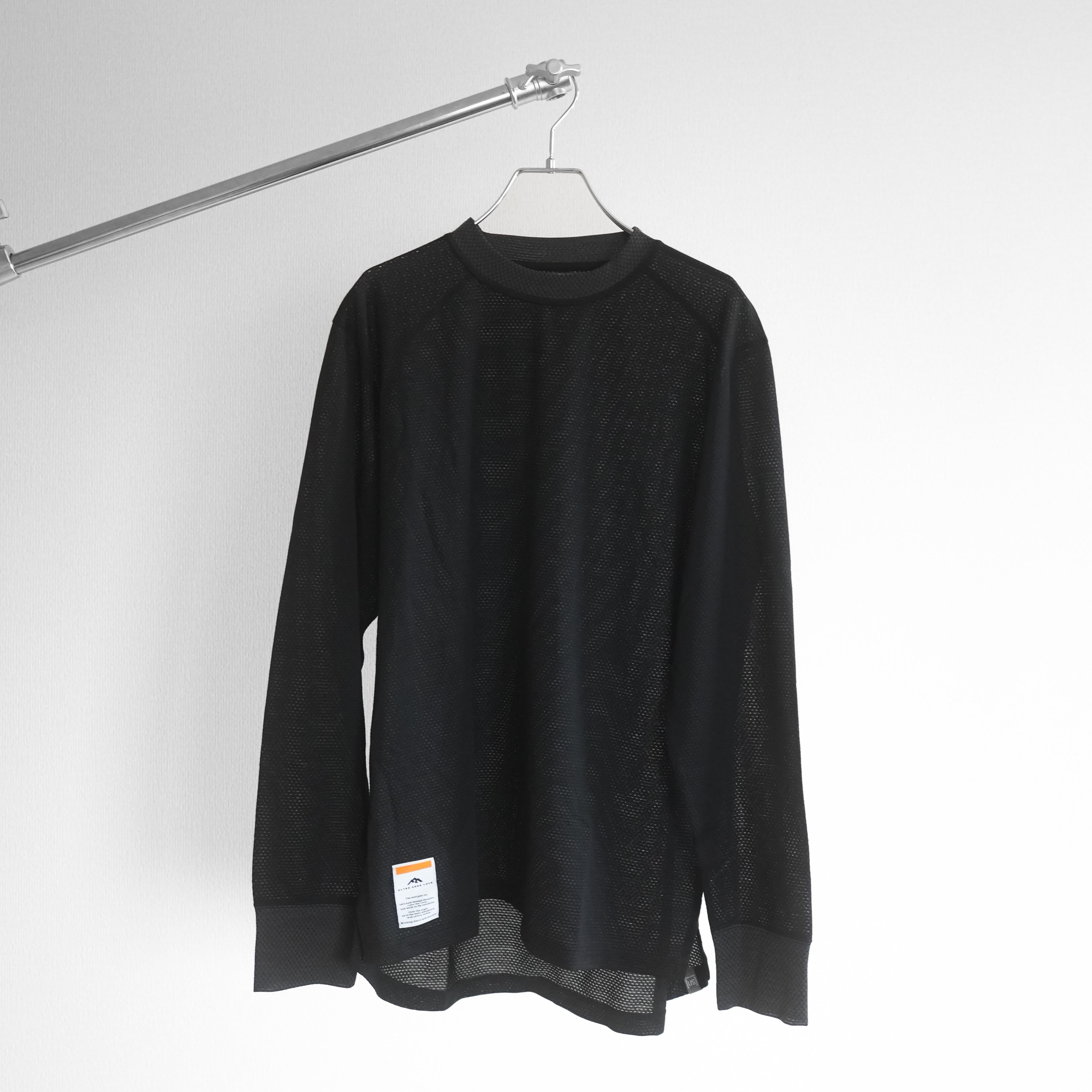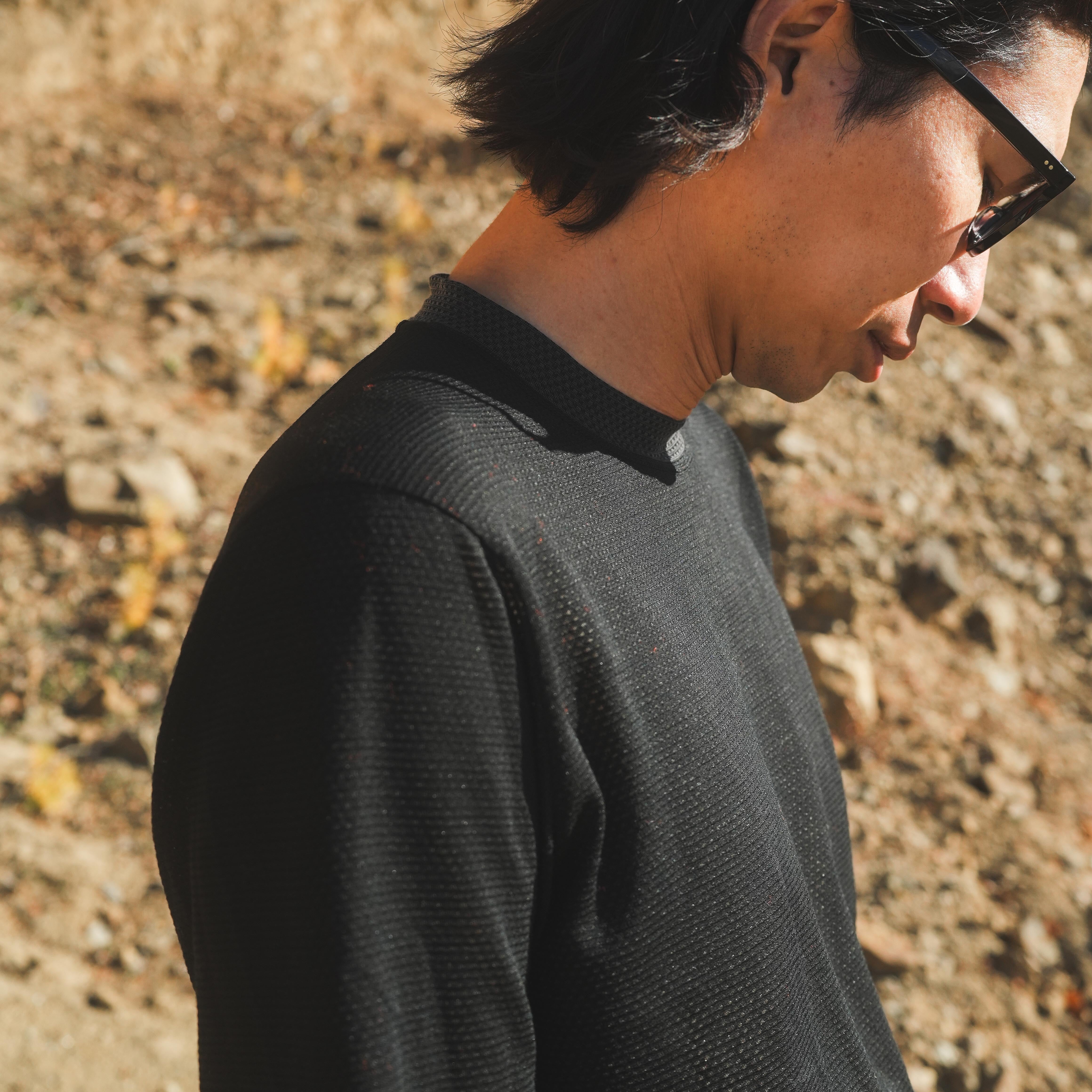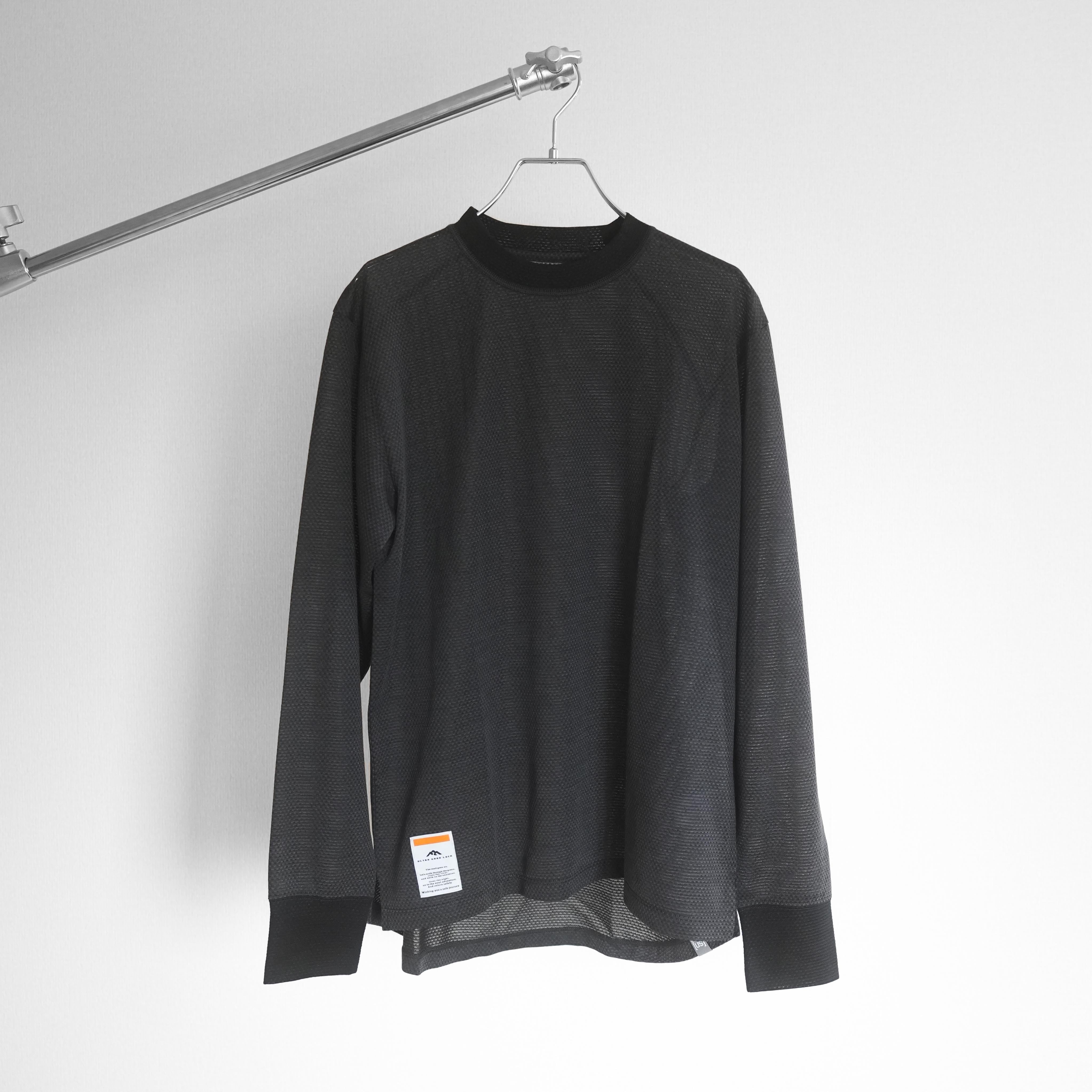 MMLT(MESH MOCK LONG T)はウール混紡のメッシュ生地を使ったモックネック仕様のロングスリーブTシャツです。ウールの弱みを化繊がカバーし、化繊の弱みをウールがカバーしたベースレイヤーとして最も望ましい一着と言えます。