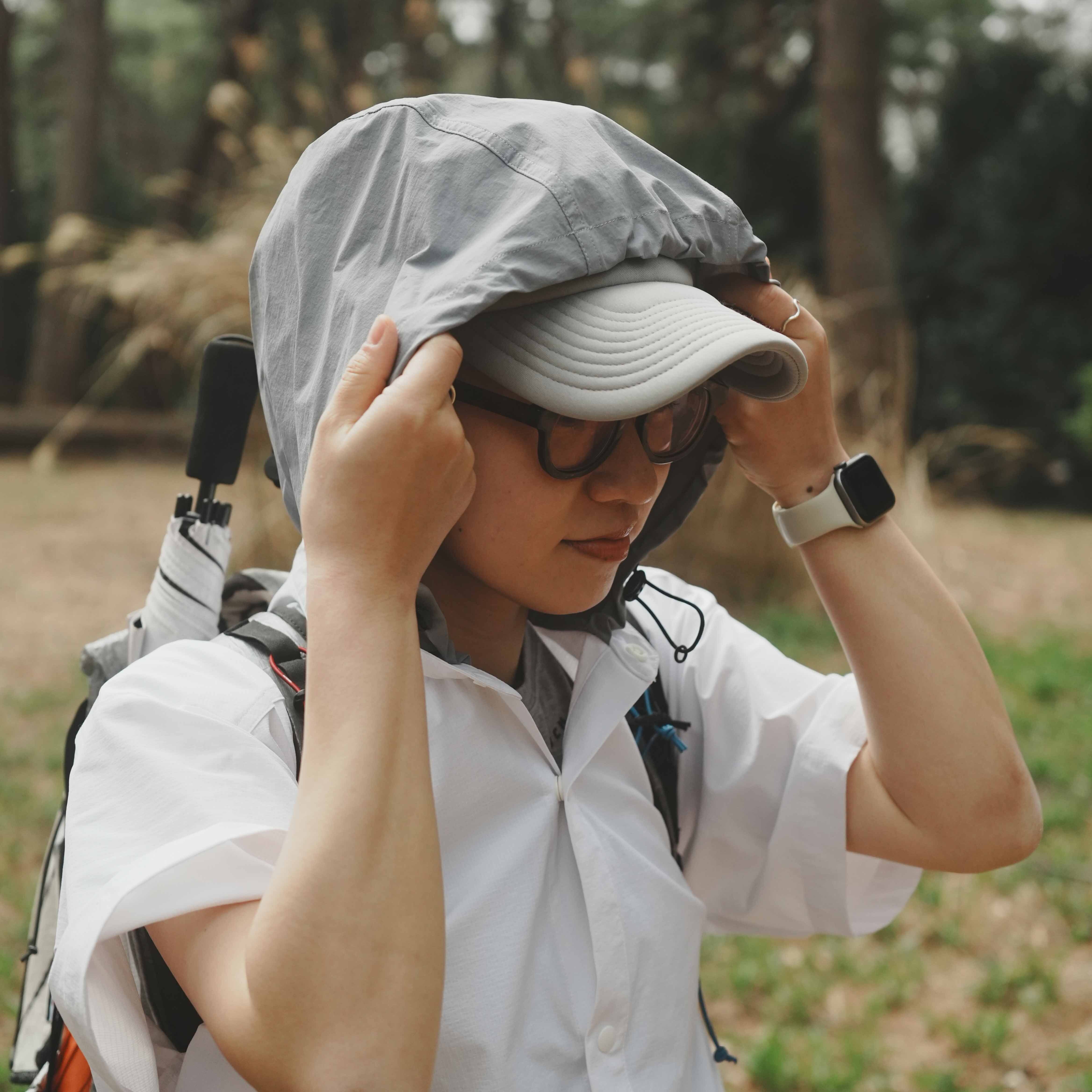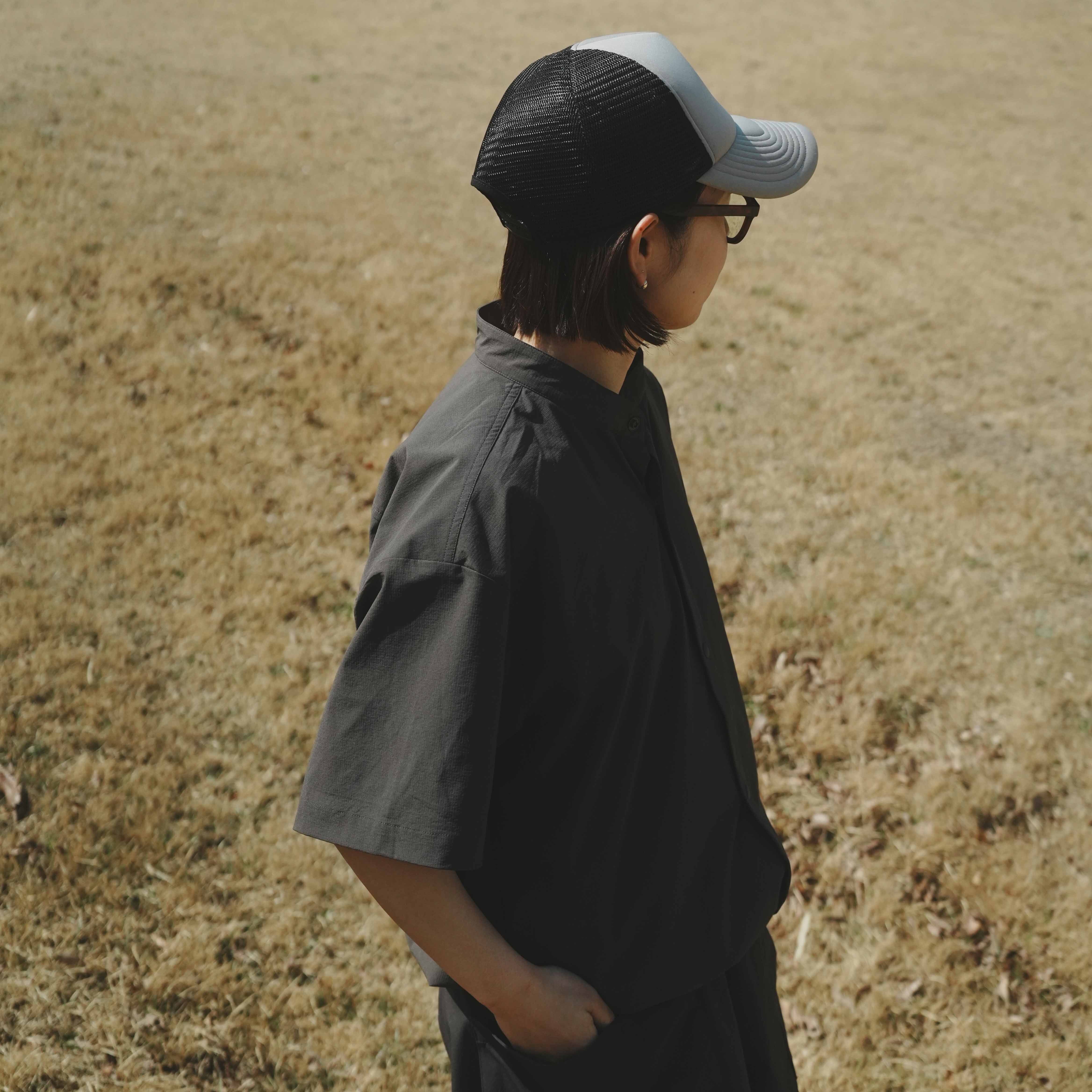 シェル等とのレイヤリングによるフード渋滞が気になる場合は、フードをシャツの内側に入れ込むことでスタンドカラーシャツに変わります。